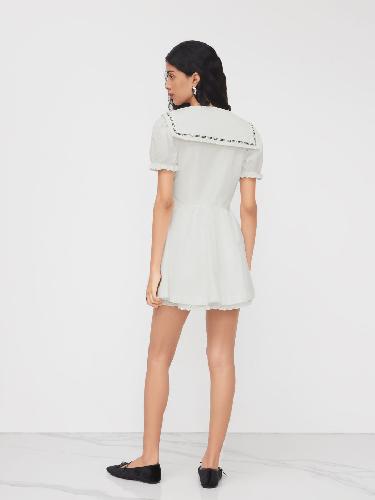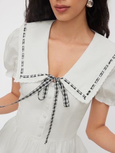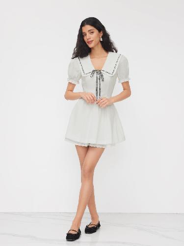 Cotton Peter Pan Collar Puff Sleeve Knotted Contrasting Binding Mini Dress